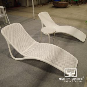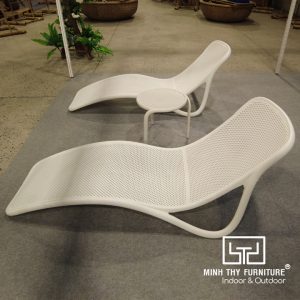 Ghế có thiết kế cong liền khối sang trọng, giúp nằm thư giãn thoải mái. Chất liệu nhựa PP cao cấp bền, chống tia UV, chịu được nắng mưa và dễ vệ sinh. Bề mặt lưới thoáng khí, không đọng nước, phù hợp cho không gian hồ bơi, resort, khách sạn hoặc sân vườn gia đình.